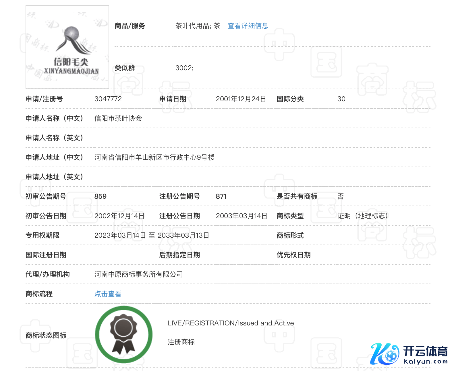 12月4日,期间财经查询中国商标网预防到,信阳市茶叶协会最早在2001年12月24日肯求了“信阳毛尖”商标,商标类型为“讲授(地舆象征)”,商品/作事鸿沟为“茶叶代用品;茶”,最新专用权期限从2023年3月14日-2033年03月13日。