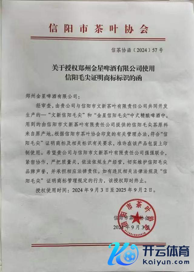 字据金星啤酒干系东谈主士向期间财经提供的文献流露,信阳市茶叶协会曾在9月3日发函授权金星啤酒使用信阳毛尖讲授商标符号。当中提到,金星啤酒与文新公司共同诞生分娩的“文新信阳毛尖”和“金星信阳毛尖”录取精酿啤酒中,用到的由文新公司提供的信阳毛尖茶原料来自原产地。字据信阳市茶叶协会印发的推敲科罚倡导,适合“信阳毛尖”讲授商标及干系符号推敲条款,准许在该居品包装上印制使用。授权使用本领从2024年9月3日到2025年9月2日。