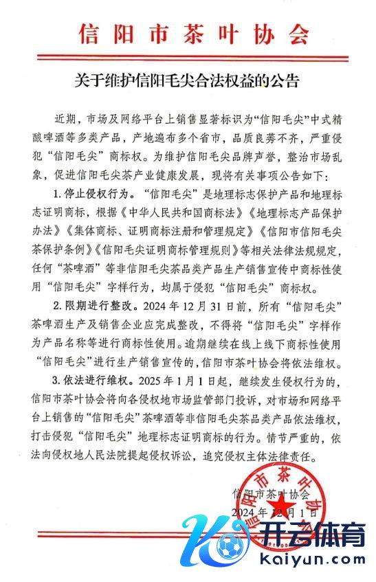 信阳市茶叶协会在《公告》中明确,扫数“信阳毛尖”茶啤酒分娩及销售企业应在2024年12月31日前完成整改,不得将“信阳毛尖”字样手脚居品称呼等进行商标性使用,过时络续在线上线下商标性使用“信阳毛尖”进行分娩销售宣传的,信阳市茶叶协会将照章维权。