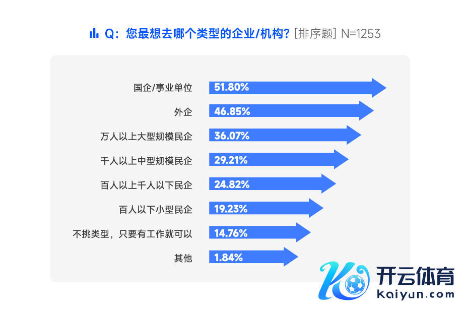 从求职想法来看,2024年,国企/行状单元依旧是职场东谈主的第一聘用, 51.80%的被调研者将其视为最念念去的企业/机构类型,其次是外企,念念去的东谈主才占比46.85%。 值得和蔼的是,本年“万东谈主以上大型范畴民企”排在第三位,与昨年同期的第5位比拟,在任场东谈主心中的“地位”高潮彰着。