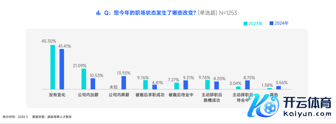 从不同职场东谈主的变化来看,2024年职场东谈主有东谈主求稳有东谈主撺拳拢袖。41.41%职场气象莫得变化,但主动下野的东谈主才占比为16.95%,高于昨年同期的12.80%。