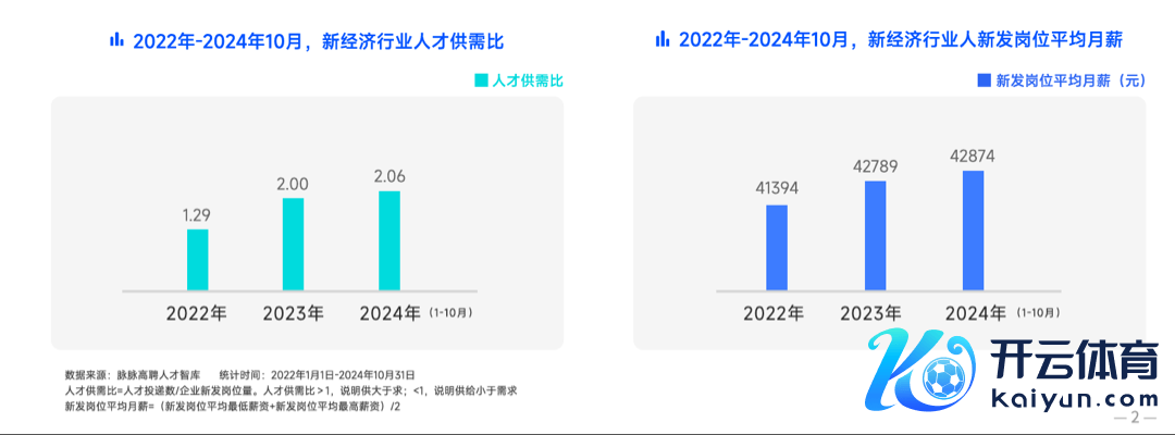 《证据》显现,2022年到2024年10⽉,新经济行业东谈主才供需比逐年高潮。2022年全年的东谈主才供需比为1.29,2023年高潮到2.00,荒谬于2个东谈主才争夺1个岗亭。2024年1-10月,东谈主才供需比再度攀升至2.06,⼈才求职竞争进一步加重。 天然求职难度较大,但岗亭薪资保抓了高潮态势。2022年全年新发岗亭的平均月薪为41394元,2023年高潮至42789元,2024年1-10月,平均月薪再度微涨至42874元。