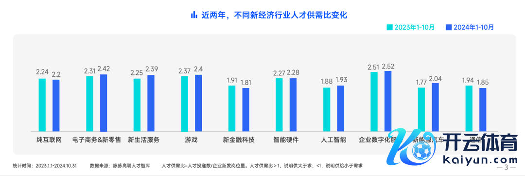 2024年1-10月,多个热点新经济行业的东谈主才供需比都在2.00险峻,但纯互联⽹、新⾦融科技和通讯⾏业的东谈主才供需比达成小幅下落。值得和蔼的是,跟着新动力汽车行业加重洗牌,该行业东谈主才供需比从1.77大幅高潮至2.04。