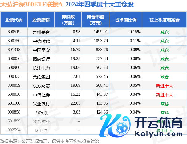 天弘沪深300ETF聚合A为指数型-股票基金,笔据最新一期基金季报知道,该基金钞票成立:股票占净值比3.21%,债券占净值比0.1%,现款占净值比6.43%。基金十大重仓股如下: