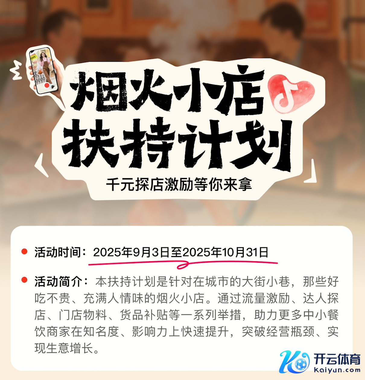 9月10日,抖音活命管事晓示上线“烟火小店扶捏探讨”,通过流量引发、达东说念主探店、门店物料、货物补贴、榜单荣誉等一系列举措,助力更多线下中小餐饮商家冲破筹划瓶颈、完终买卖增长。商家可在抖音搜索“寻味烟火气”活动,进入“交出你的矿藏烟火小店”版本提交小店信息,或联系抖音业务司理报名。据了解,“烟火小店扶捏探讨”是抖音活命管事“寻味烟火气”系列活动之一。“寻味烟火气”活动旨在通过流量引发、活动定制文创附进等多重奖励尊龙凯时体育,饱读吹达东说念主与用户打卡烟火小店,发掘街边好意思食。